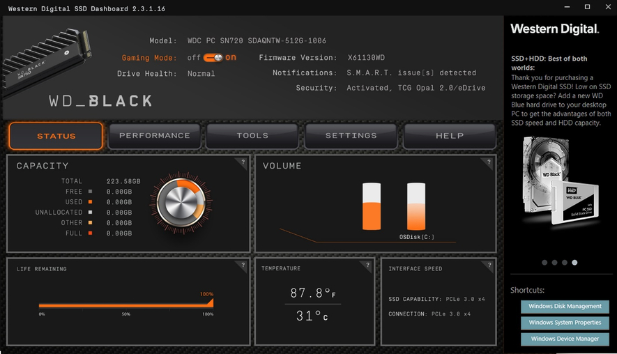 추후 좀 더 상세한 리뷰에서 이야기를 하겠지만, 전용 'WD Black SSD 대시보드'를 이용하면 게임 모드 등에 대한 사용이 가능한데요. 게이밍 PC를 목적으로 하는 분들이라면, 저전력 모드를 비활성화함으로써 SSD 성능이 좀 더 오랫동안 최고 수준에 머무르게 설정할 수가 있습니다. ▼