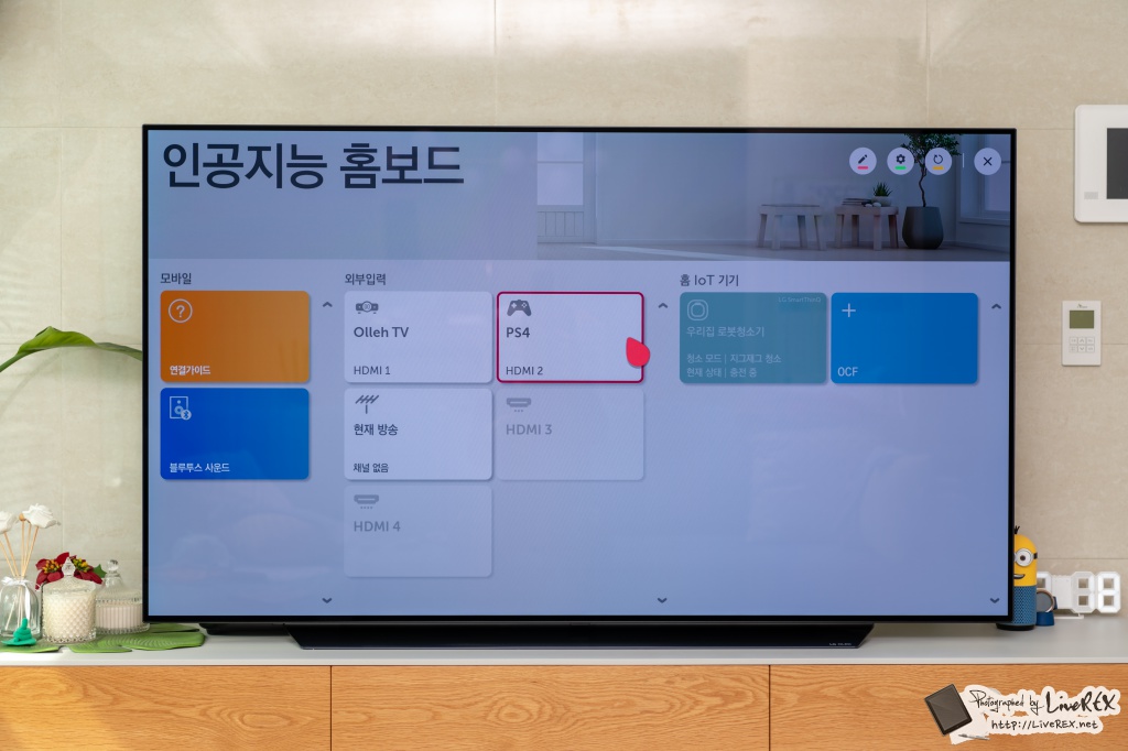 또, 셋탑박스 / 플레이스테이션 등 외부 입력이 필요한 기기를 번거로운 조작 없이 단번에 연결하고 사용할 수 있다는 점도 좋네요. 기존에 쓰던 제품이 이 부분에서 정말 짜증 유발자였는데.. LG 올레드TV AI ThinQ는 칭찬할만한 간편함을 보여주더군요.