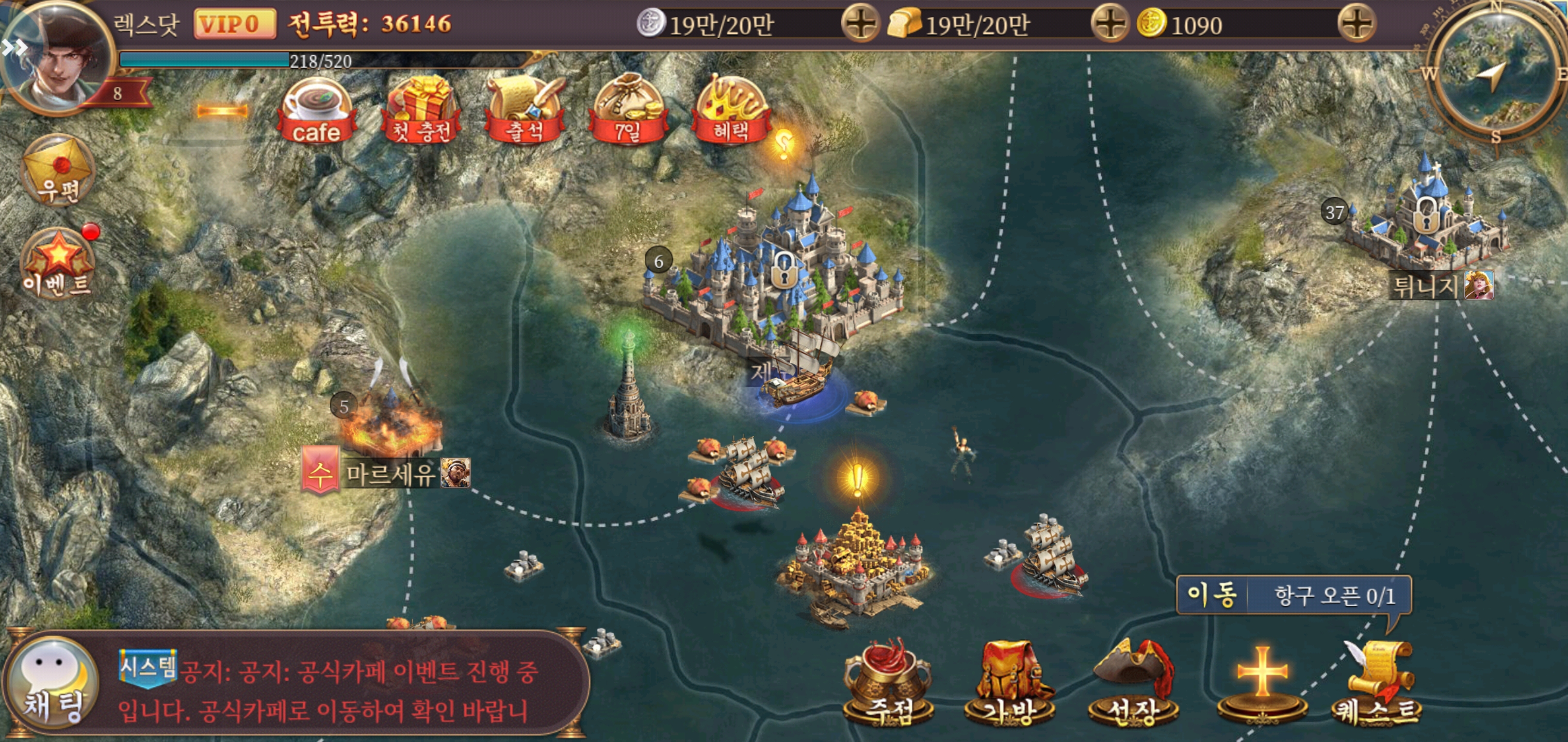 기본적으로 항해를 하면서 도시를 점령하고, 해적을 소탕하는 등의 활동을 하게 되는데요. 도시 하나하나를 차지하기 위한 퀘스트 등이 여러가지로 구성되어 있어 지루할 틈 없이 게임을 플레이할 수 있는 게 특징이기도 합니다. ▼