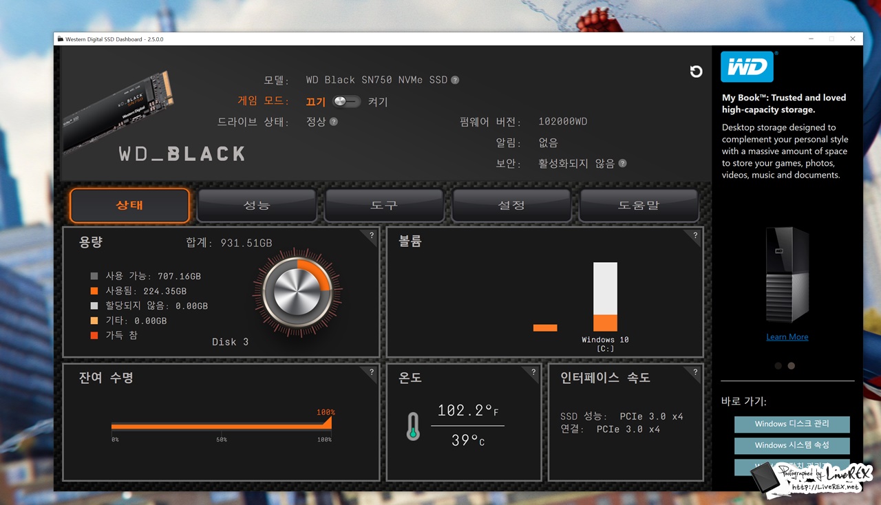 WD Black SN750 모델을 이용한다면, 게이밍 모드 기능이 추가된 'WD Black 전용 SSD 대시보드'를 활용하는 게 가능합니다. ▼