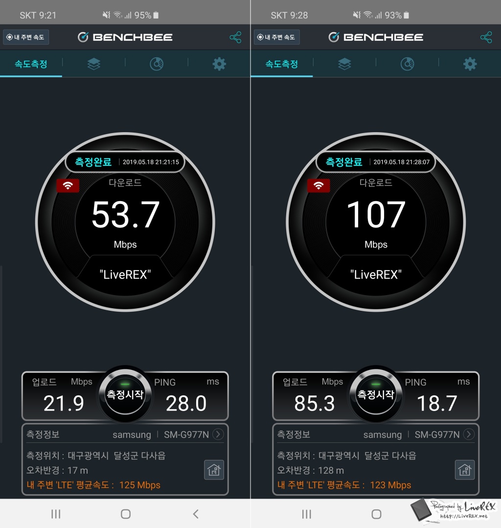 아래는 동일한 장소에서 와이파이 증폭기 EX8000을 끄고, 켜면서 테스트를 해 본 결과인데요. 확실히 와이파이 속도가 나아지는 걸 엿볼 수 있네요. 굳이 어떤게 켠 건지는 말하지 않아도 아실 듯. ▼