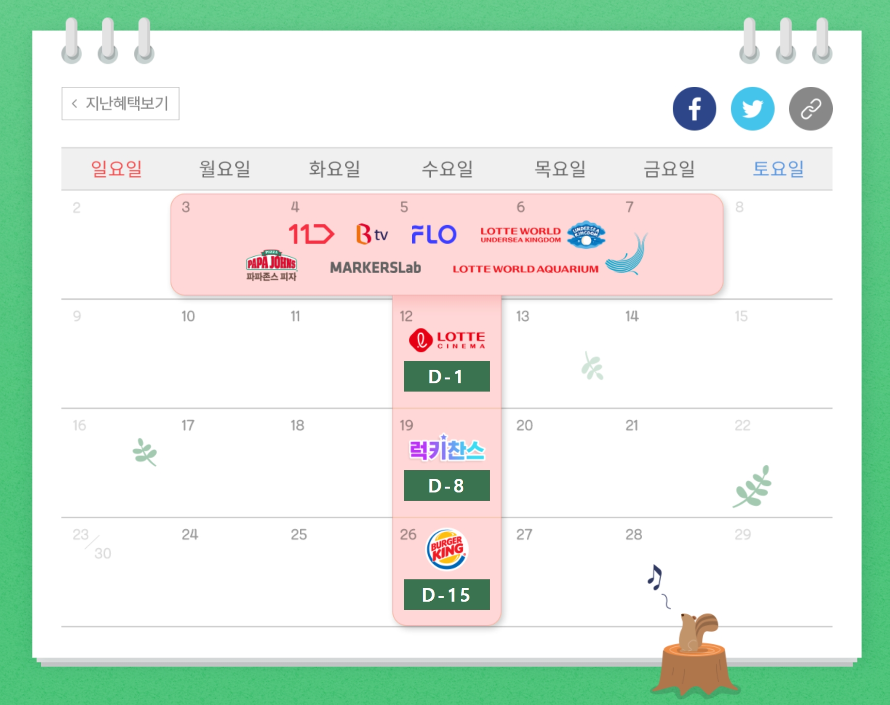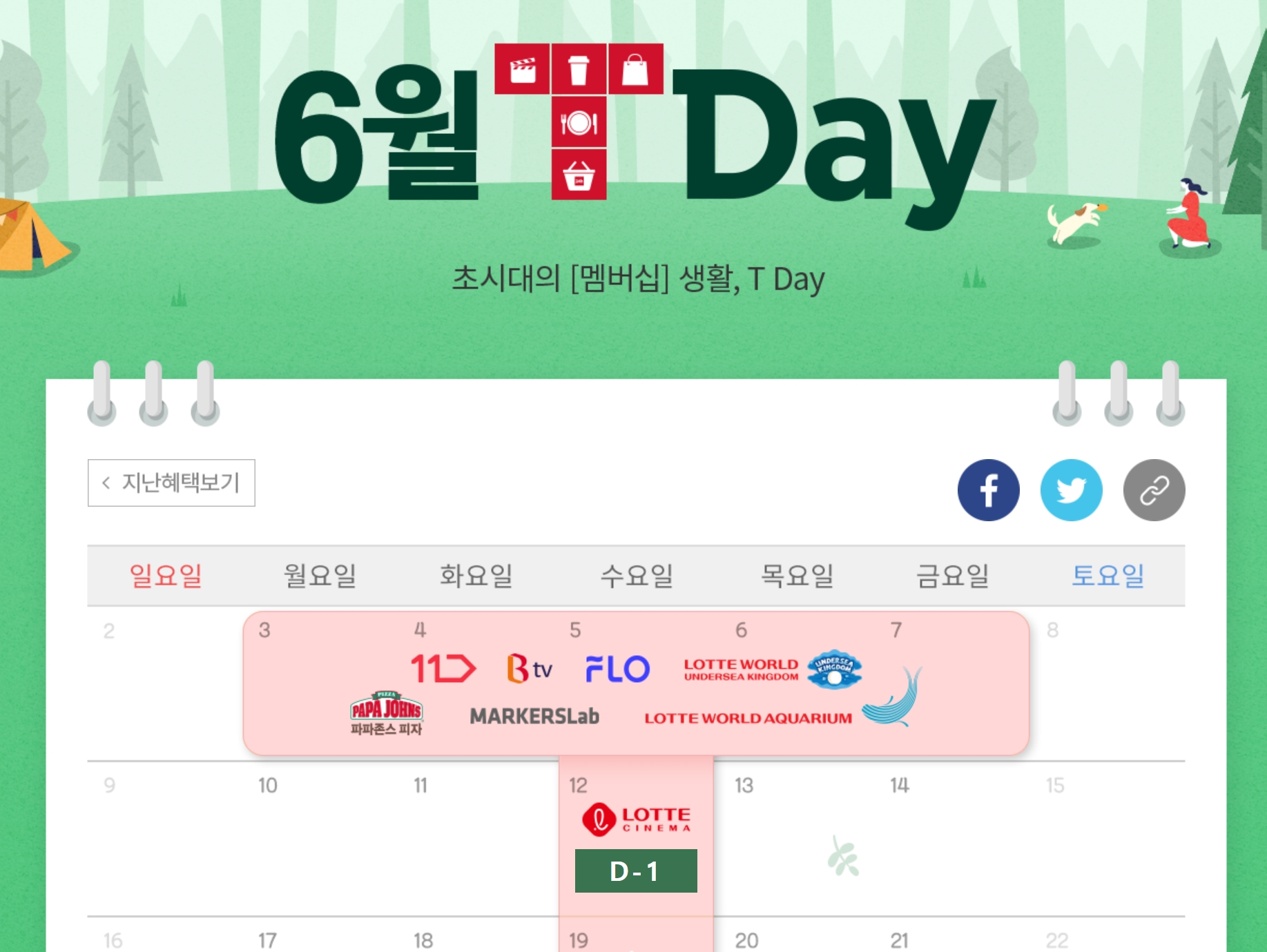 이번 6월을 기준으로 했을 때, 첫 주에는 파파존스 피자, 롯데월드, 11번가, BTV 할인 등이 제공되었었고, 이후 둘째 주 부터는 매주 수요일을 기준으로 놓치지 말아야 할 것들이 자리잡고 있는 모습입니다.