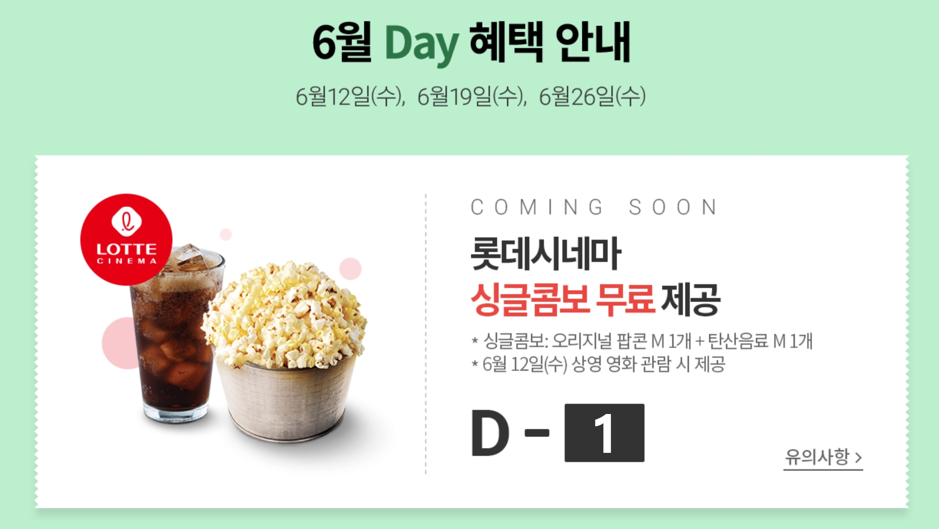 6월 12일 수요일에는 롯데시네마 싱글 콤보( 오리지널 팝콘 M사이즈 1개 + 탄산음료 M사이즈 1개)가 무료로 제공되는데요. 당일이 되면 앱에서 바로 이를 사용할 수 있게 됩니다.