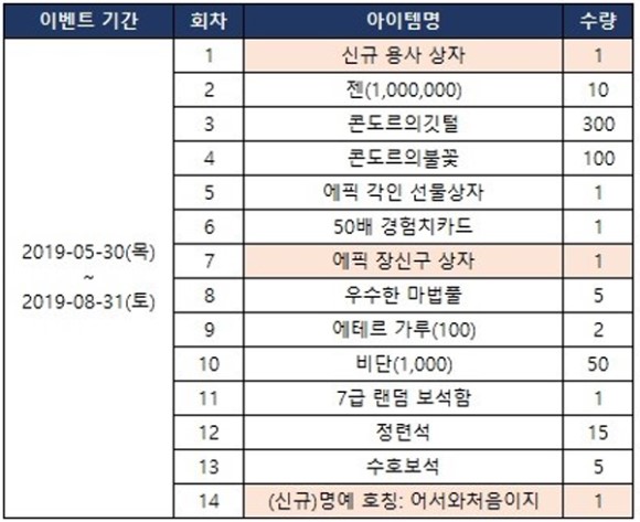 1일차부터 대박이라 할 만한 아이템이 가득합니다. 신규 용사 상자가 주어지는데, 5티어 장비가 완벽하게 지급되기 때문에 장비 걱정 없이 플레이를 이어갈 수 있는 장점이 있어요~