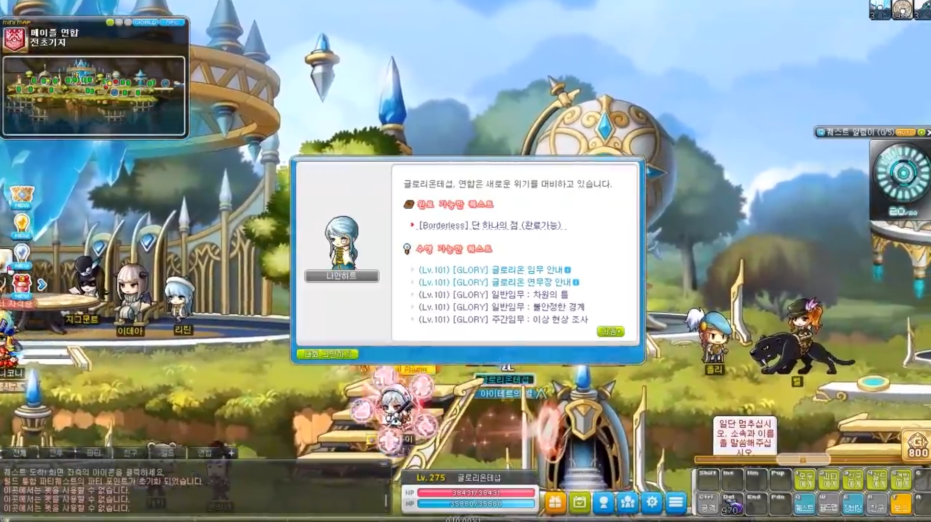 메이플 연합이 검은마법사에 승리를 거두긴 했지만, 여전히 위협이 남아 있는 메이플 월드. 위협으로부터 메이플 월드를 지키기 위해 정예 특수 팀 '글로리온'이 탄생한 것이 이번 업데이트의 주요 내용입니다. 글로리온은 메이플 연합 전초기지를 베이스로 하여 다양한 미션을 수행하게 됩니다.