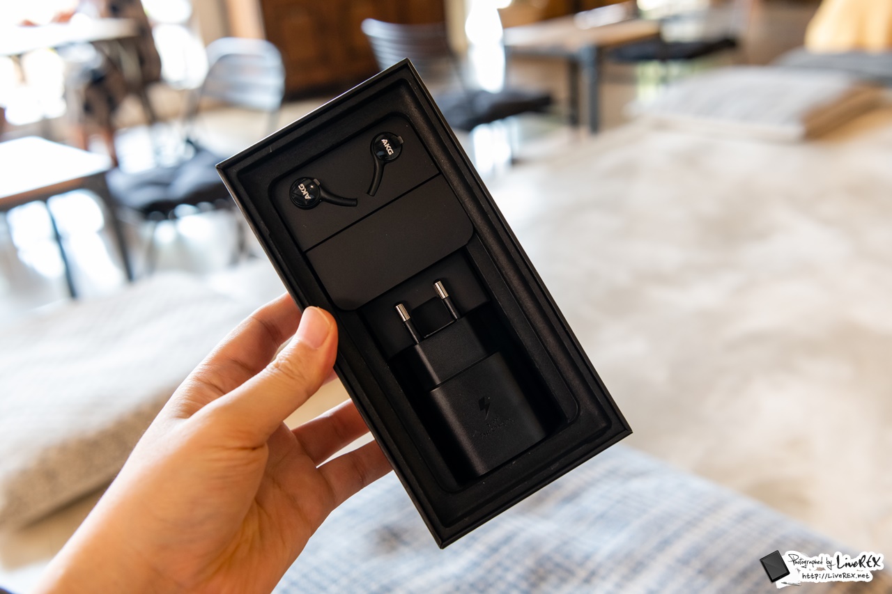 구성품은 갤럭시노트10 본체를 비롯해 AKG 번들 이어폰(유선), 25W 충전기, USB-C 케이블, 여분의 S펜 팁, 젤리 케이스 등이 포함되어 있습니다. ▼