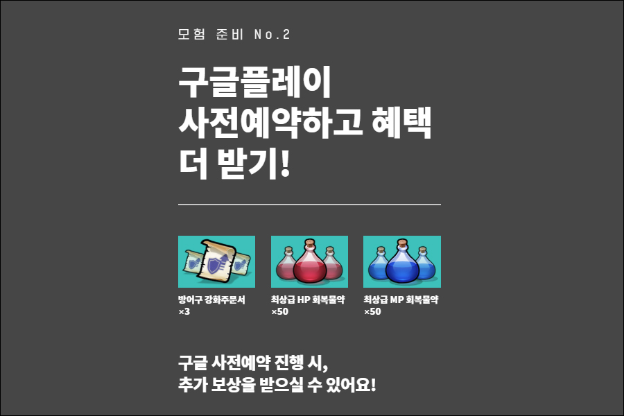 이에 더해 구글 플레이 사전예약까지 참여하면 방어구 강화주문서 3장, 최상급 HP/MP 회복 물약 각 50개씩이 추가로 주어지네요.