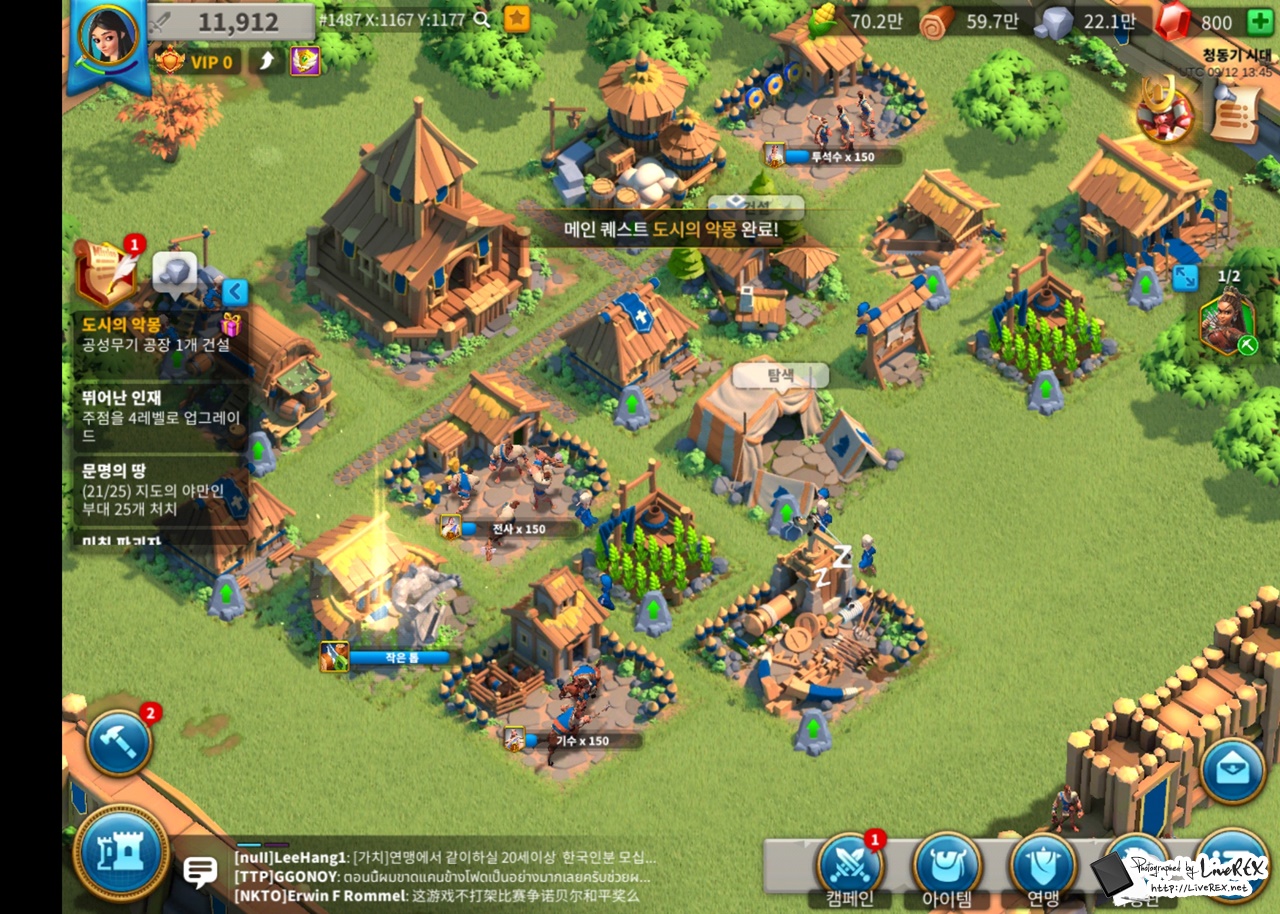 영토를 성장시키면서 건물을 레벨업하는 것. 즉, 내정을 다지는 것 외에도 세계로 나가 야만인을 처치하거나 필요한 자원 채취를 하는 것도 가능합니다. 다만, 단계별로 필요한 조건이 있어서 앞서 말한 내정을 다지는 걸 기본으로 하면서 연구 및 사냥을 꾸준히 해주는 게 중요해요.