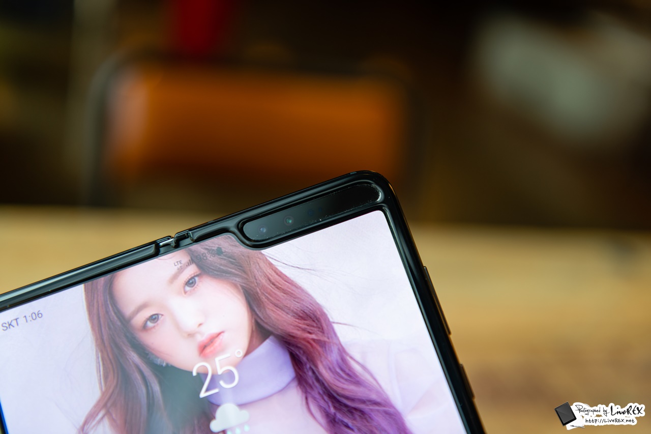 갤럭시 폴드는 커버 즉 접었을 때 화면에 HD+ 해상도의 21:9 비율 4.6인치 디스플레이가 적용되어 있습니다. 여기서 위로 시선을 올리면, 수화부 스피커와 1000만 화소 카메라가 보여요. ▼