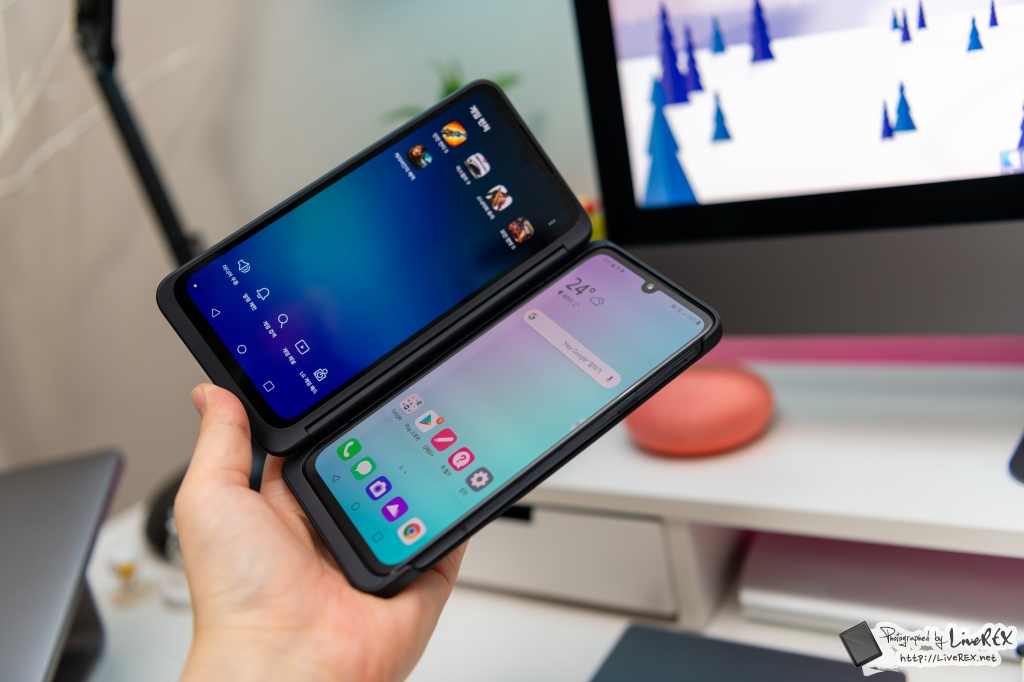 듀얼 스크린을 펼쳐보면, 기존과 달리 V50S와 듀얼스크린의 화면부가 꽤 통일감 있게 처리된 걸 알 수가 있습니다. ▼