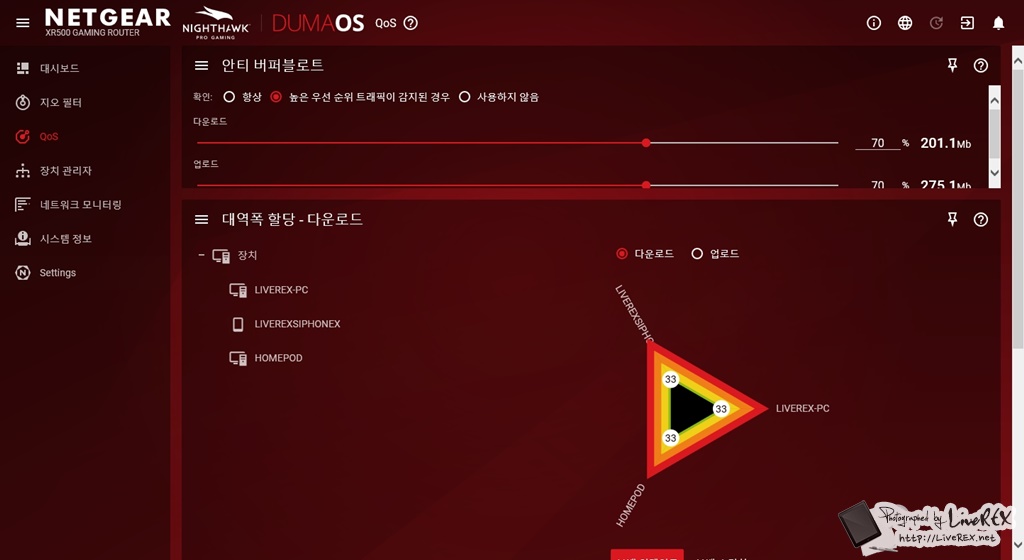 그리고 QoS 메뉴에서도 재밌는 게 보여요. ‘안티 버퍼블로트’와 ‘대역폭 할당’ 기능인데요. ▼