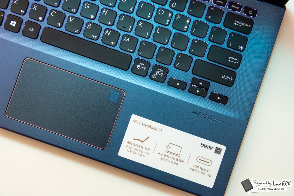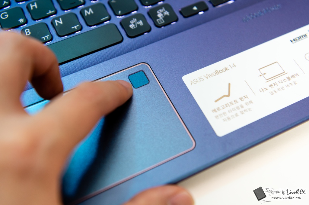 터치패드 상단 모서리 쪽으로는 지문센서가 있어요. 그래서 보안성 측면에서도 좋은 점수를 줄 수 있겠습니다. 윈도우10 특유의 재주를 활용하기에도 좋구요. ▼