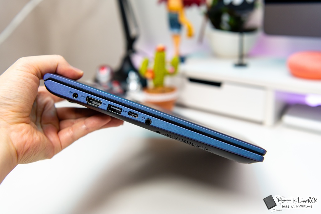 ASUS 비보북 X412FL 양 측면에는 마이크로 SD카드 리더기, USB2.0, 전원 포트, HDMI 포트, USB3.1 타입A, USB3.1 타입C, 3.5mm 오디오 단자가 위치해 있습니다. ▼