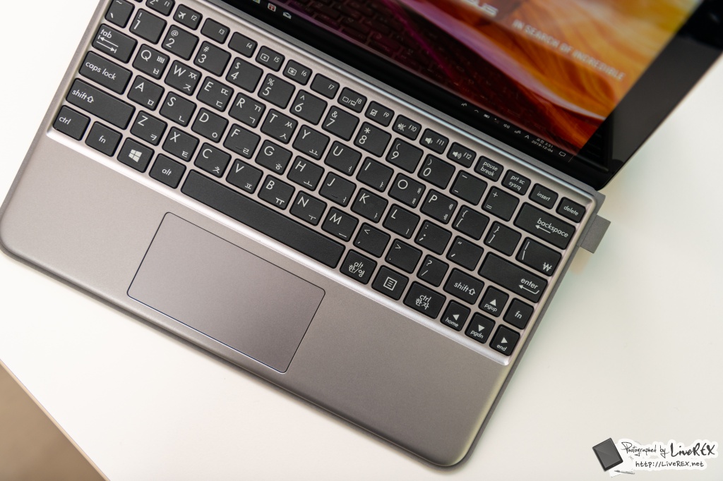 하판이 되는 키보드 독에는 자판과 터치패드가 보입니다. 아무래도 기기 자체가 10인치 수준이라 이런 류에 익숙하지 않은 분들은 너비 등에서 어색할 수도 있을 듯 한데요. ▼