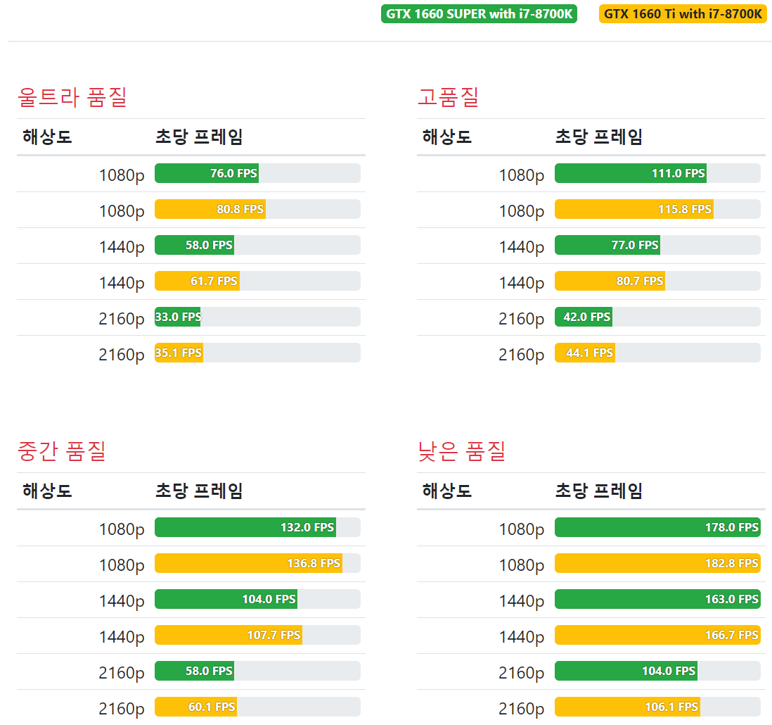 실제로 벤치마크 사이트를 통해 공유되는 아래 이미지를 보시면 해상도 별로 GTX 1660 슈퍼와 Ti가 큰 차이가 없는 성능을 발휘하는 걸 아실 수 있을 텐데요. (출처)▼