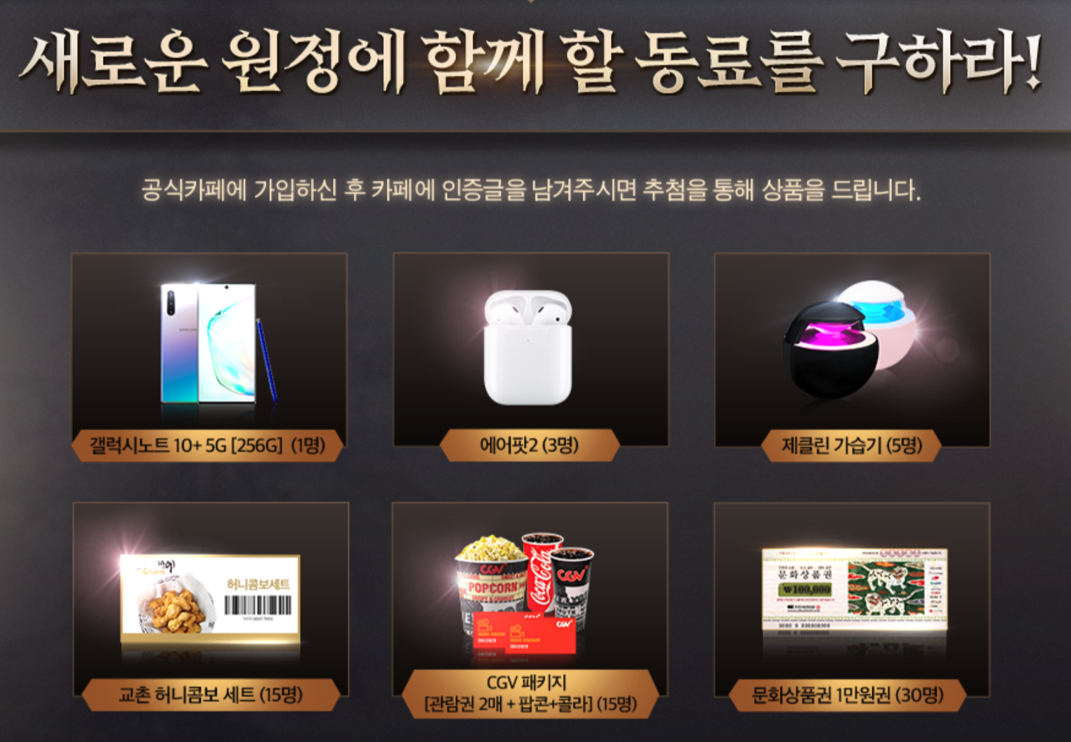 또한, 공식 카페 가입을 인증하는 것으로도 보상이 있습니다. 갤럭시노트 10 플러스와 에어팟 등을 구할 기회가 생기는데요. 심히 탐나는 부분이 아닌가 싶네요.