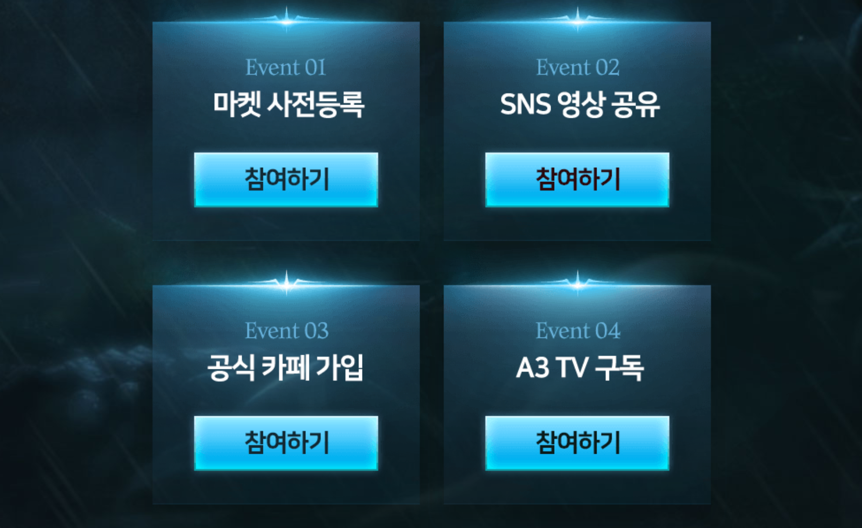 사전등록 이벤트로 마켓 사전등록과 함께 SNS 영상 공유, 공식카페 가입, A3 TV 유튜브채널 구독 이벤트 등이 이뤄지는 걸 확인할 수 있는데요.
