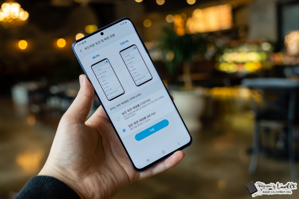 120Hz 를 설정했음에도 특정 상황에서는 단말기가 저절로 60hz 설정으로 전환하게 됩니다. 예를 들어서, 42도 이상 온도 / 5% 이하 배터리 / 내비게이션을 비롯해 카메라 등 특정 앱에서는 60Hz로 작동해요.