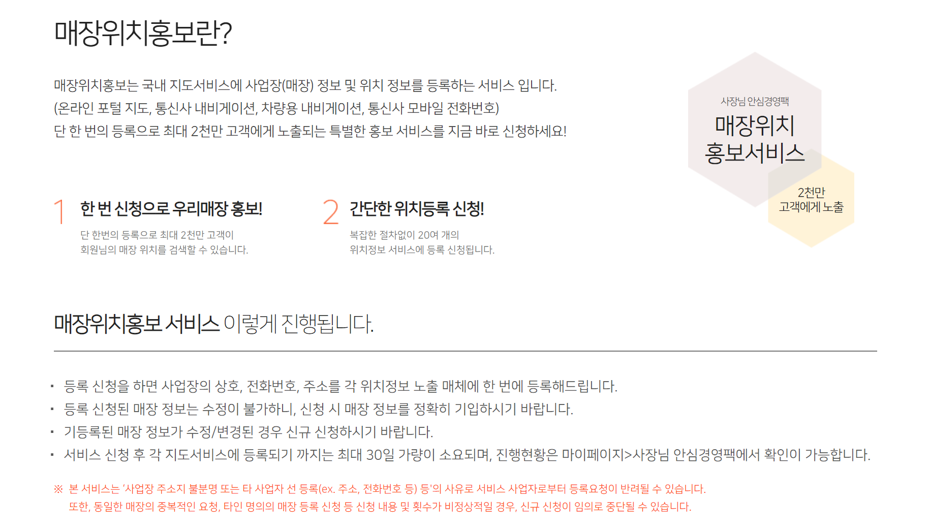 사장님 안심경영팩은 매장 위치 홍보에 등록만 하면 한번 신청으로 T전화, T맵, 원내비, 다음 / 구글 등 포털 지도, 카카오내비 등 네비게이션에도 일괄 등록되면서 수십개 채널과 함께 최대 2천만 고객에게 홍보. 즉, 그 위치가 자연스럽게 노출됩니다. 만약 여러 매장을 보유한 사장님이라면 최대 3개 매장까지 위치 등록이 가능하니 알아두시면 큰 도움이 될 듯 하네요.