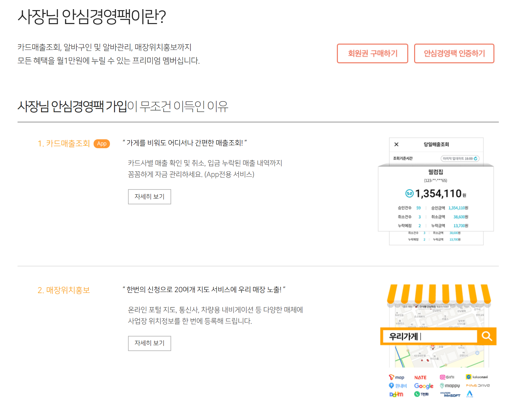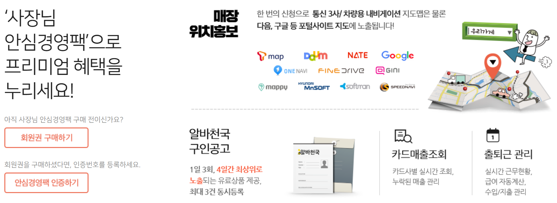 그렇다면 해당 서비스가 어떤 이유에서 이득이냐? 간단하게 말하면 카드매출 조회, 매장위치 홍보, 출퇴근 관리, 알바구인서비스 등을 이용할 수가 있습니다.