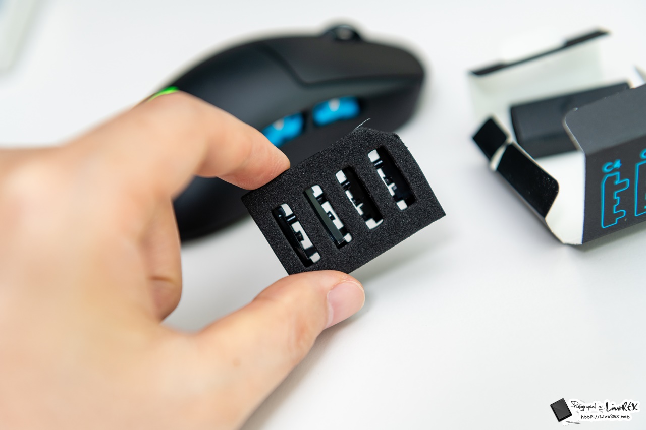 바닥면에는 DPI 변환 스위치가 자리하고 있습니다. 일반적인 마우스와는 다소 다른 배치죠? 처음에는 어색할 수 있을지 몰라도 오히려 장시간 쓴다고 봤을 때 오작동 등에 대한 불편을 줄일 수 있어 더 긍정적으로 다가오기도 하는 것 같네요. ▼