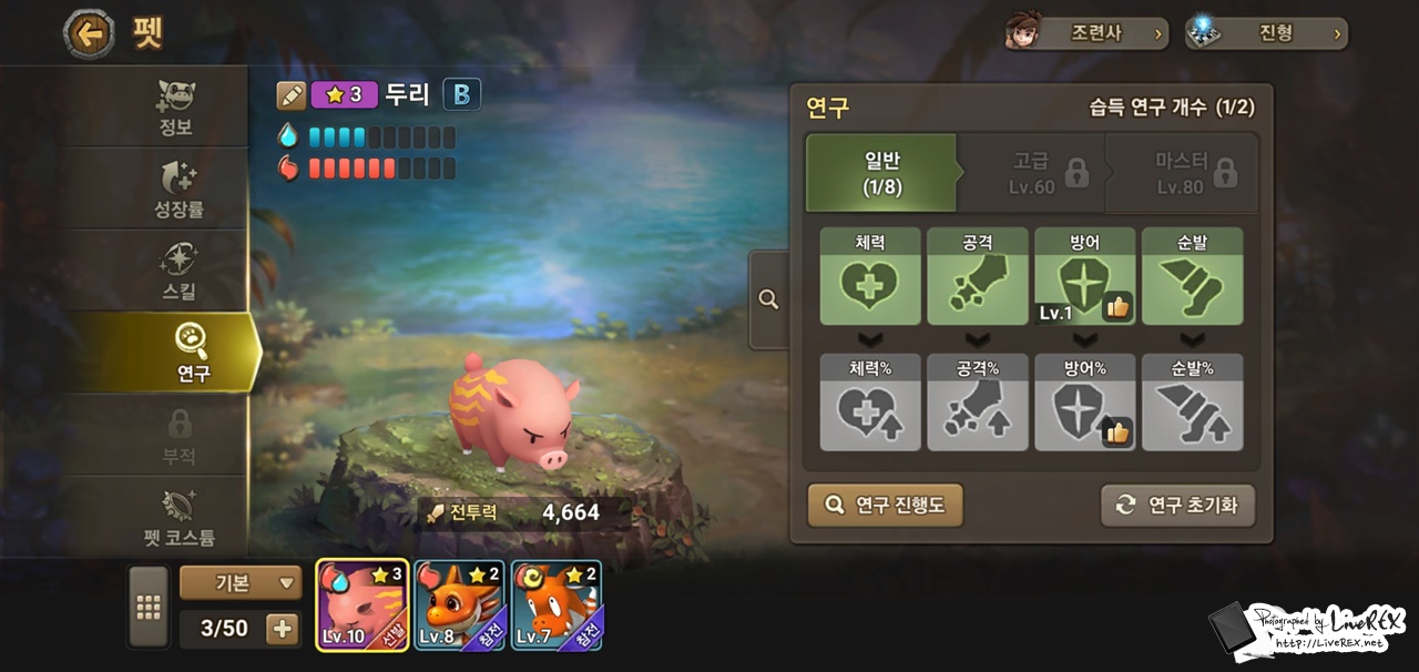 진형 배치, 레벨업, 승급, 연구 등 전투력을 끌어올리기 위해 꽤 다양한 것들을 접할 수 있다는 것도 재미를 주는 요소가 아닌가 싶네요. 참고로, 각각의 펫은 고유 능력치, 특성, 성장률, 스킬을 가지고 있습니다.