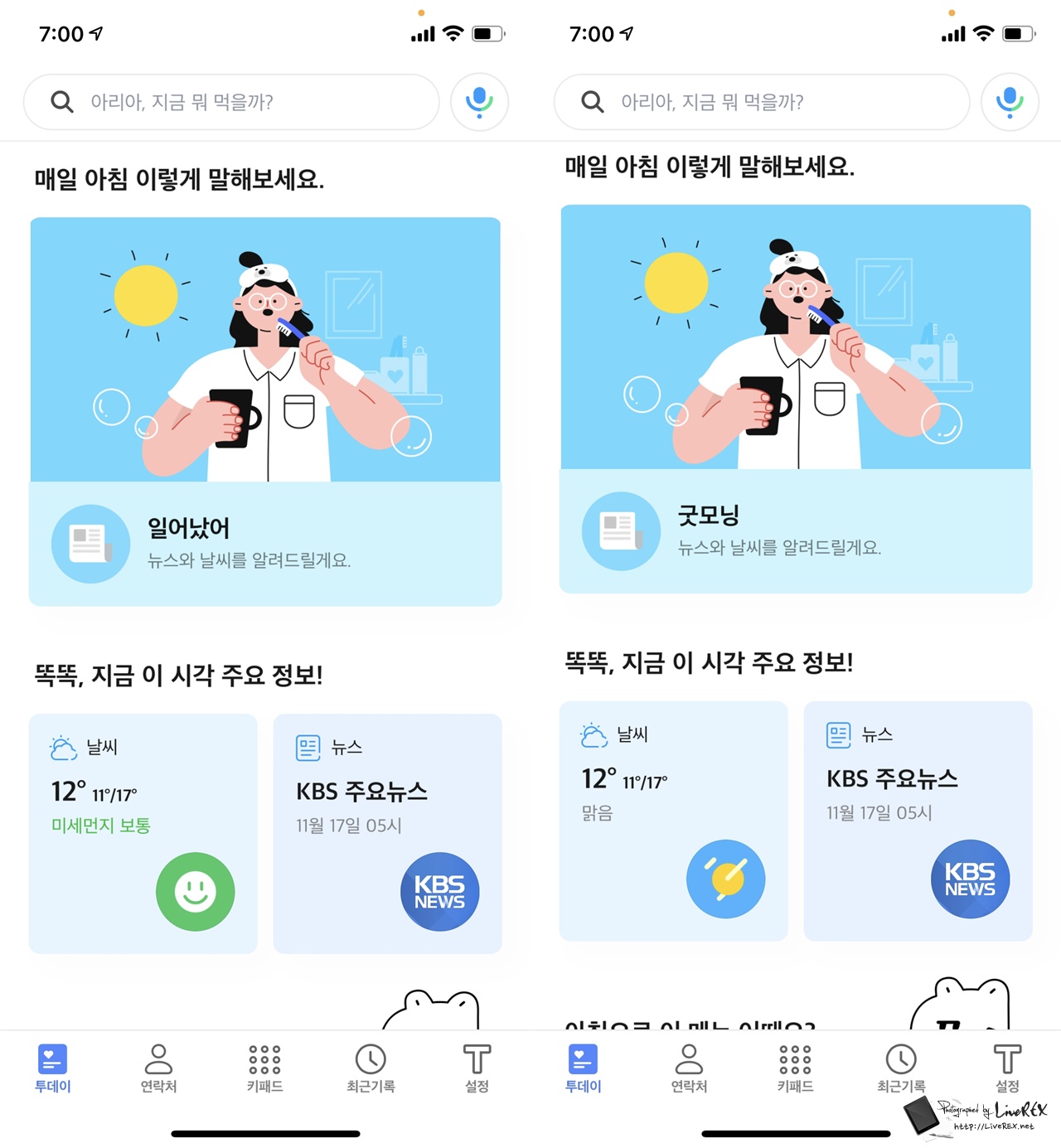 최신버전으로 T 전화 앱을 업데이트 한 뒤 NUGU 계정 관리 연동을 하면 손쉽게 그 기능을 이용할 수 있습니다. 하단 메뉴 바에서 '투데이' 를 선택하면 곧장 여러가지 기능을 체크할 수 있기도 한데요.