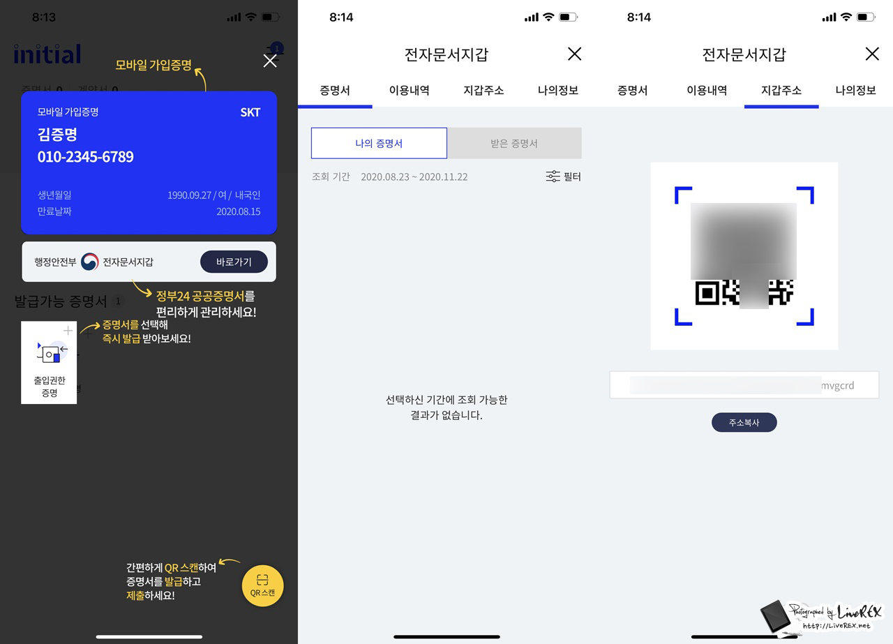 ‘이니셜’ 전자문서 지갑 서비스가 그것인데요. 지난 9월 SKT와 행정안전부가 체결한 전자증명서 발급·유통시스템 이용 활성화를 위한 업무협약 이후로 스마트폰에서 관련된 사용이 가능하도록 행정안전부가 운영하는 정부24와 ‘이니셜’ 앱을 연동하는 방식으로 구현됐다고 하네요.