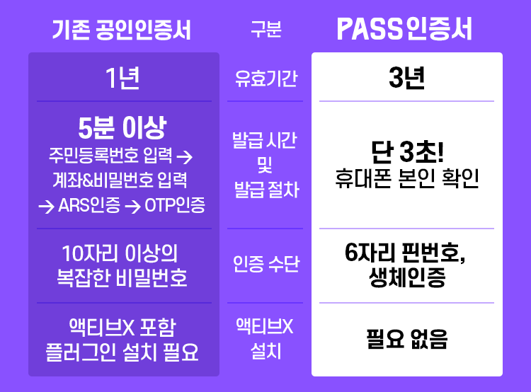 PASS 인증서는 유효기간이 1년에서 3년으로 늘어났으며, 발급절차와 발급 시간 역시 간단한 특징이 있습니다. 또, 6자리 비밀번호(핀) 뿐만 아니라 생체인증으로 인증도 가능해 더 편리한 사용이 가능해요.