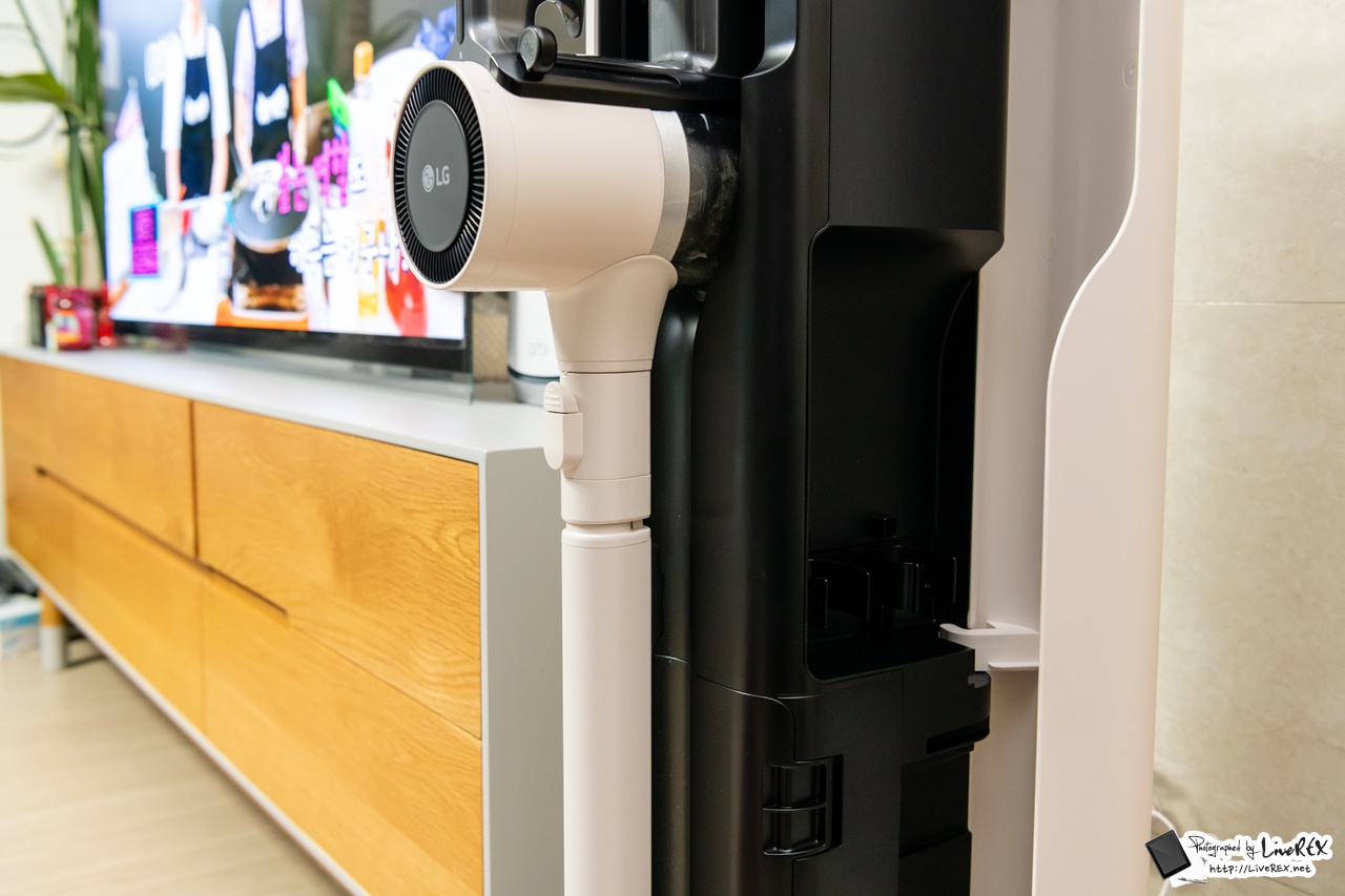 이를 통해 먼지통비움(먼지통 열기-비움-닫기), 충전, 청소기 보관까지 모두 한 번에 가능합니다. 이 모델이 발표될 때 부터 바로 이 올인원타워가 어떤 모습일지 궁금했었는데, 실제로 보니 공간 절약에 인테리어 효과까지 단번에 잡는 영리함이 돋보이더군요.