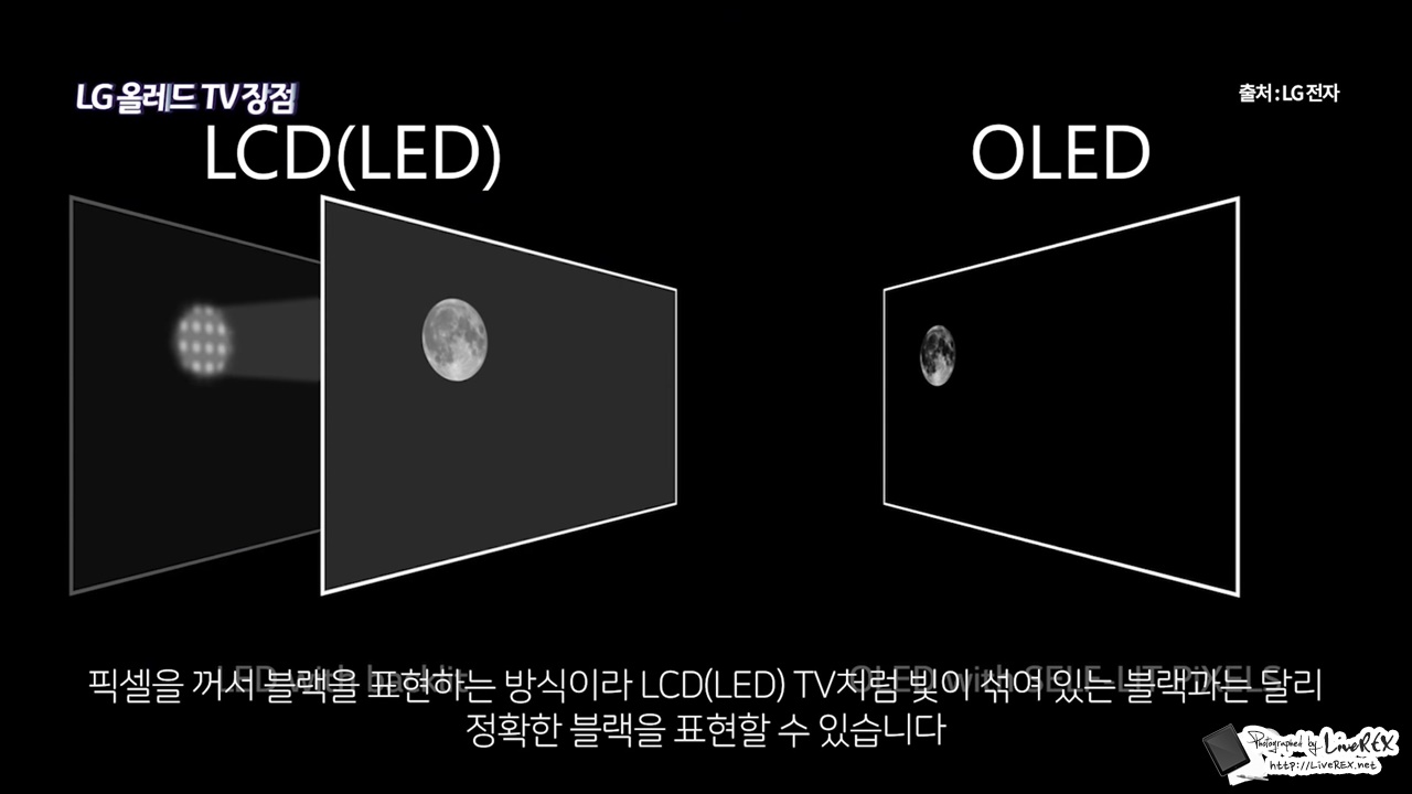 수 차례 강조했었죠? LCD(LED) TV는 스스로 빛을 낼 수 없어 TV의 뒤쪽에서 빛을 비추어주는 조명(광원)이 필요한 반면 올레드 TV 는 그런 것이 필요가 없습니다. 즉, 백라이트(광원)가 없는 TV는 올레드 TV가 유일한 것이죠.