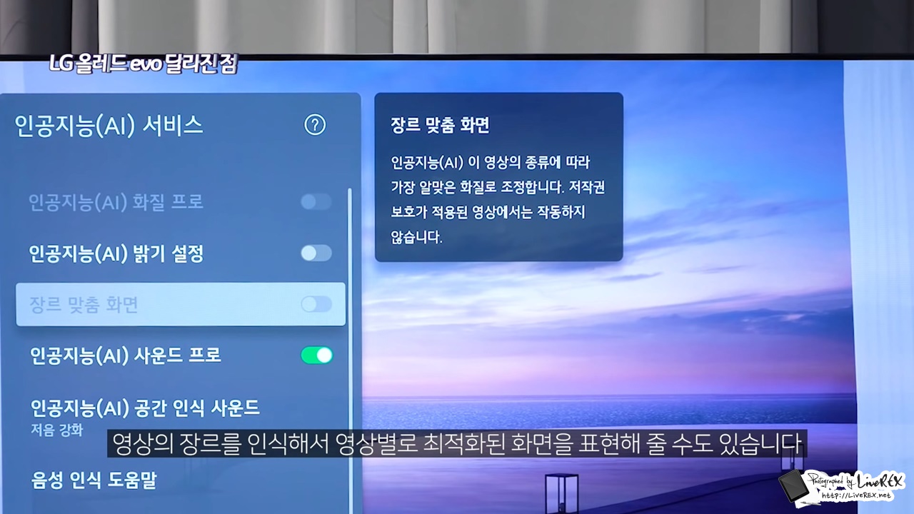 그리고 본연의 성능! 올레드 소자 성능을 한층 업그레이드하면서 더 밝은 화면을 보여주고 보다 더 정확한 색 표현이 가능합니다. 게다가 4세대 인공지능 α9이 탑재되어 있어 화질 장르맞춤화면, 장면단위 화질 최적화 등으로 업스케일링, 사운드는 버추얼 5.1.2로 업믹스 등을 지원하는 것도 특징이예요.