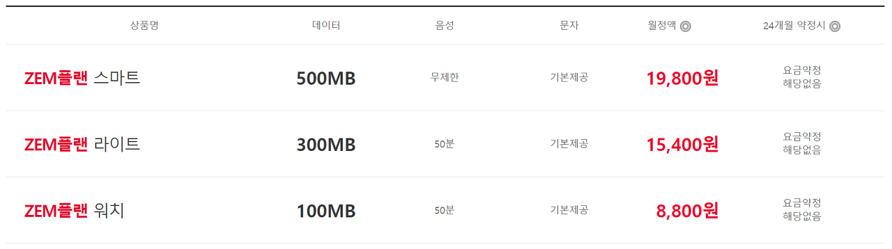 월 8,800 원의 ZEM 워치 요금제는 4,400 원, 15,400 원의 ZEM 라이트 요금제는 7,700 원, 18,900 원의 ZEM 스마트 요금제는 9,450 원으로 할인됩니다.