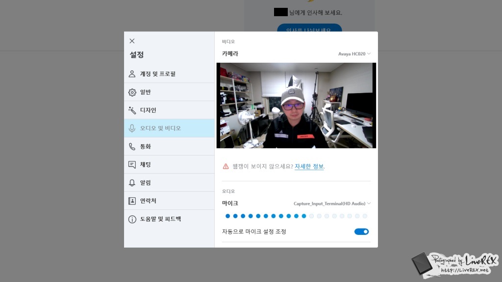 별다른 설정을 할 것도 없이 기본적으로 비디오 / 오디오(마이크) 모두 Avaya HC020를 잡으면서 사용에 전혀 문제가 없음을 보여주더군요.