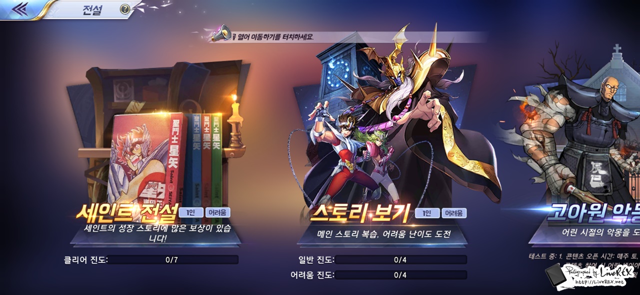 그 가운데 유독 눈에 띄는 건 '전설'인데요. 세인트의 성장 스토리와 많은 보상을 받을 수 있는게 특징으로 각 세인트의 이야기를 다루고 있기 때문에 원작을 아는 분들에게 특히 더 주목을 받을 것 같기도 합니다. ▼