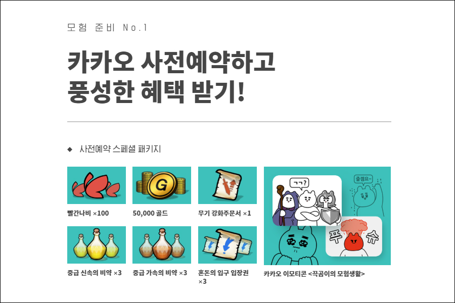 카카오게임 사전예약에 참여하면 빨간 나비 100개, 5만 골드, 무기 강화 주문서, 중급 신속/가속의 비약 3개씩, 혼돈의 입구 입장권 3장, 카카오 이모티콘 끅곰이의 모험 생활을 보상으로 받을 수 있습니다.