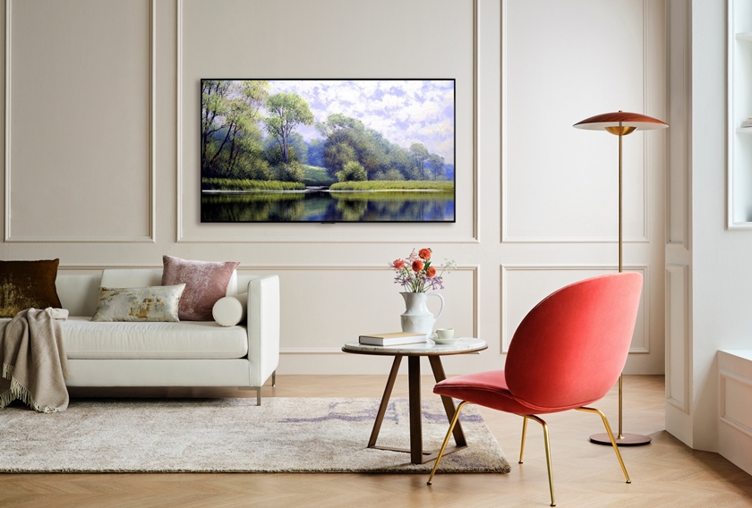 먼저, 디자인 측면을 꼽을 수 있겠습니다. LG 올레드 evo는 2020년 GX 모델과 동일한 갤러리 디자인을 보유하고 있어요. 갤러리 디자인이란, TV 하나에 화면 구동부, 스피커, 설치를 위한 브라켓까지 담아 TV 사용을 위한 별도 외부 본체가 없는 슬림한 디자인을 말하는 것으로 벽에 걸 경우 본체 없이 화면만 돋보이는 미니멀한 인테리어로 갤러리 느낌의 인테리어 연출이 가능한 특징이 있습니다.
