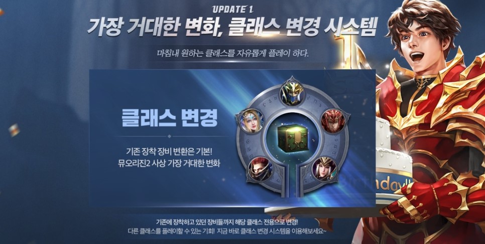 이벤트를 집어 보았으니 이번에는 업데이트와 관련해서 짚어보도록 할까요. 아마 많은 분들이 바랬던 부분이 아닐까 싶습니다. '클래스 변경'이 가능해집니다. 각 이용자마다 메인으로 키우는 캐릭터가 있을 텐데요. 그럼에도 뭔가 또 다른 직업을 해보고 싶다 생각하던 분들이라면.. 이제 번거로움, 불편 없이 클래스 변경이 가능해요. 반가운 소식이죠? ^^