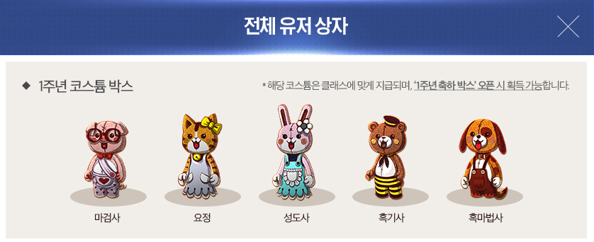 뿐만 아니라, 전체 유저에게 1주년 코스튬 박스와 1주년 출석체크 보상이 있으니 이런 것들도 꼭 체크해서 받아가세요.