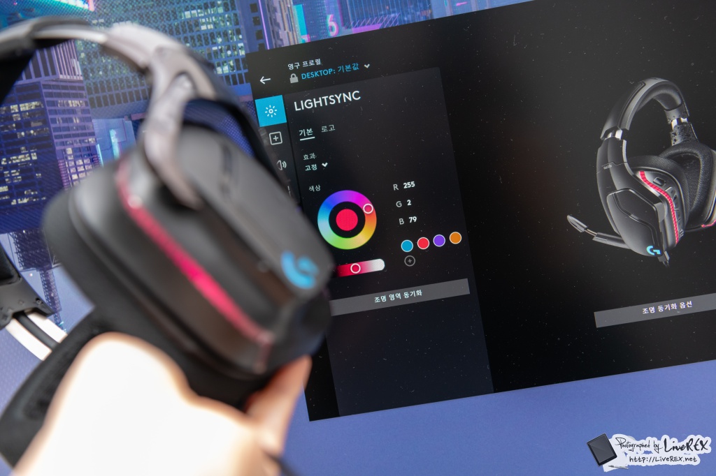 헤드셋을 연결하면 바로 그 화려한 멋을 체감할 수 있습니다. RGB 조명이 들어오는데요. 무려 1680만 가지 컬러를 지원합니다. 아래에서 언급하겠지만, ‘G HUB’를 통해 원하는 설정이 가능합니다.