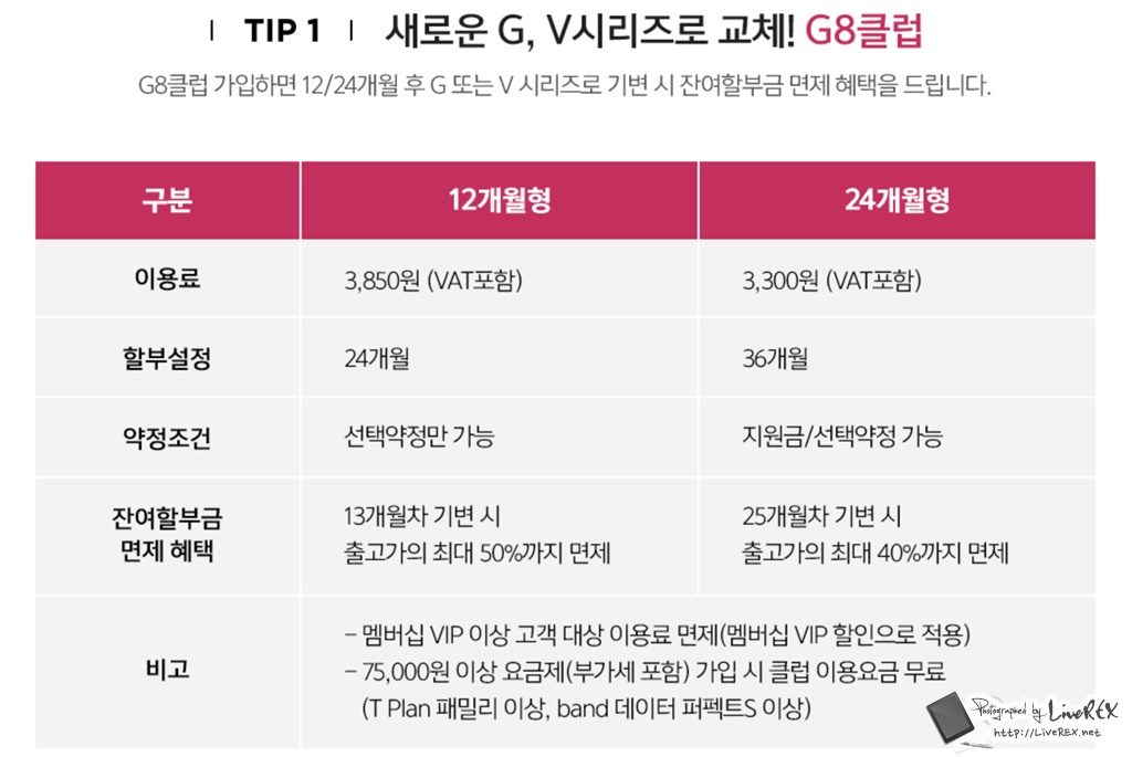 G8클럽 가입 후 12/24개월이 지난 시점에 G 또는 V 시리즈로 기변시 잔여할부금을 면제 받는 혜택부터, 제휴 카드를 이용해 72만원 더블할인, 쓰던 폰 반납하고 현급으로 돌려받는 프로모션 등 꽤 다채롭게 내용이 마련되어 있으니 관심있는 분들은 → 여기를 참고해 보세요.