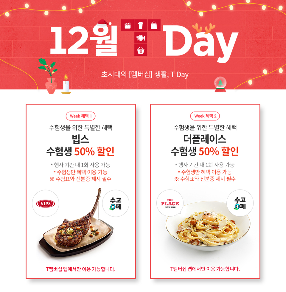 아직 조금 더 남았어요. SKT는 12월 동안 파격적인 T멤버십 할인 혜택을 준비했다고 합니다. 외식, 쇼핑, 컬처 등에서 할인 혜택을 누릴 수 있는데요. 수험표 인증 절차를 거쳐 빕스, 더플레이스 50% 할인 등 다양한 혜택을 누릴 수 있어요.