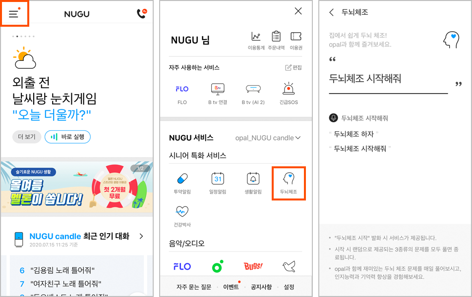 서비스 가입을 마치면 메인 메뉴에서 NUGU opal 전용 서비스를 살펴볼 수 있습니다. 앞서 언급한 투약 알림, 일정 알림, 생활 알림, 두뇌 체조 등이 표시되는 걸 알 수 있네요. ▼