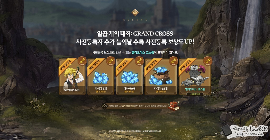 이와 같은 특징을 가진 일곱 개의 대죄 그랜드 크로스는 현재 → 사전예약을 진행 중에 있습니다. 누적 참여자 수에 따라 다른 보상이 주어지는데, 이미 100만은 넘어섰기 때문에 최대치로 선물을 얻을 수 있다는 건 반가운 대목이 아닐까 싶네요.