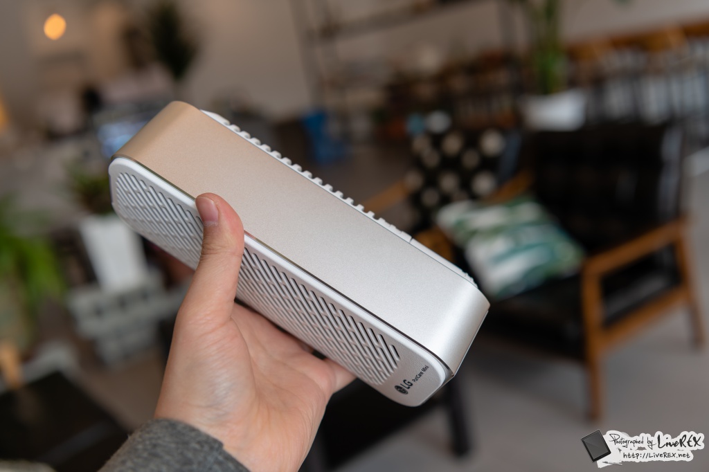 LG 퓨리케어 미니 공기청정기의 디자인을 좀 더 짚어볼까요. 전후면을 제외하고 프레임 부분은 메탈 소재로 처리되어 있습니다. 해서 꽤 고급진 인상을 주네요. 내구성 측면에서도 부족함이 없어 보입니다. ▼