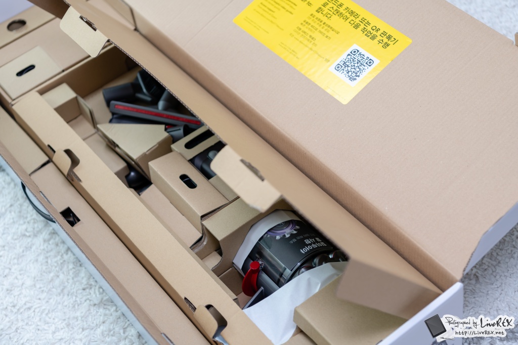 하이 토크 드라이브 헤드, 소프트 롤러 클리너 헤드, 도킹 스테이션, 충전기, 크레비스 툴, 콤비네이션 툴, 미니 모터 툴, 미니 소프트 더스팅 브러쉬, 매트리스 툴, 스터번 더트 브러쉬, 청소봉 클립, 스탠드형 충전 거치대 그리고 무선청소기 본체 등이 제공되는 걸 알 수 있네요.