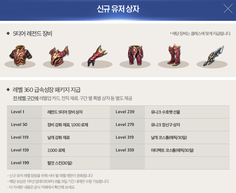 1일차부터 대박이라 할 만한 아이템이 가득합니다. 신규 용사 상자가 주어지는데, 5티어 장비가 완벽하게 지급되기 때문에 장비 걱정 없이 플레이를 이어갈 수 있는 장점이 있어요~