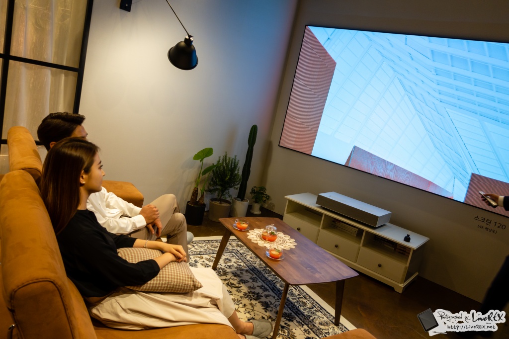 현장에서는 벽면에서 단 18.3cm 떨어진 거리에서 120인치 스크린을 경험해 볼 수도 있었어요. 놀랍더군요 ^^