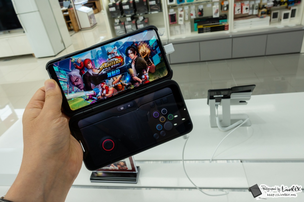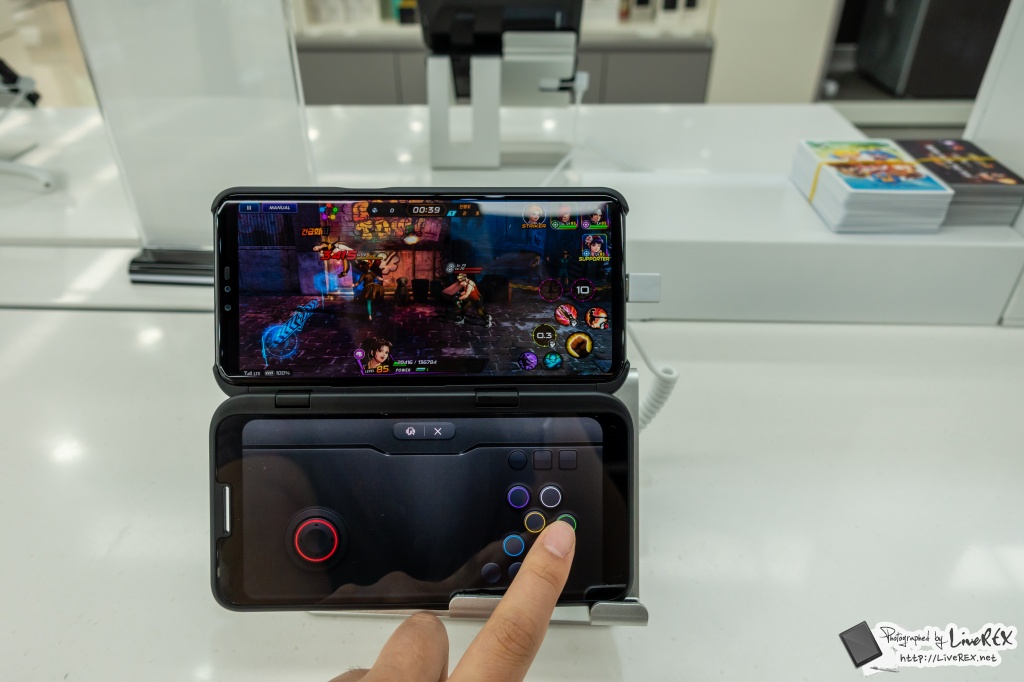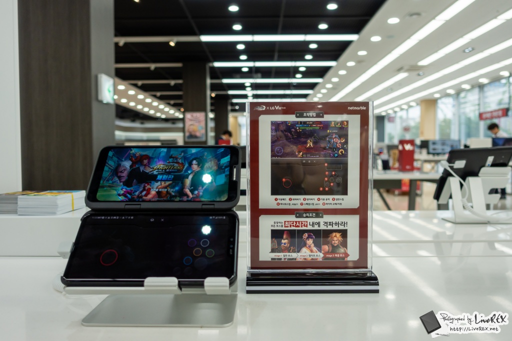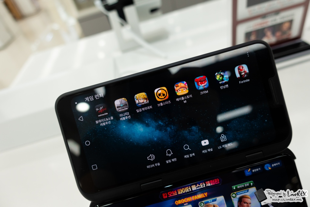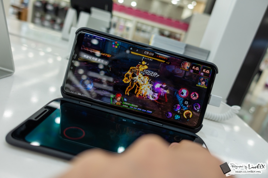 현장을 찾아 대회가 진행되는 공간을 찾아보니, 바로 눈에 띄는 건 LG V50이 '듀얼스크린'과 같이 진열이 되어 있고 이를 통해 게임을 플레이할 수 있다는 점이었는데요. ▼