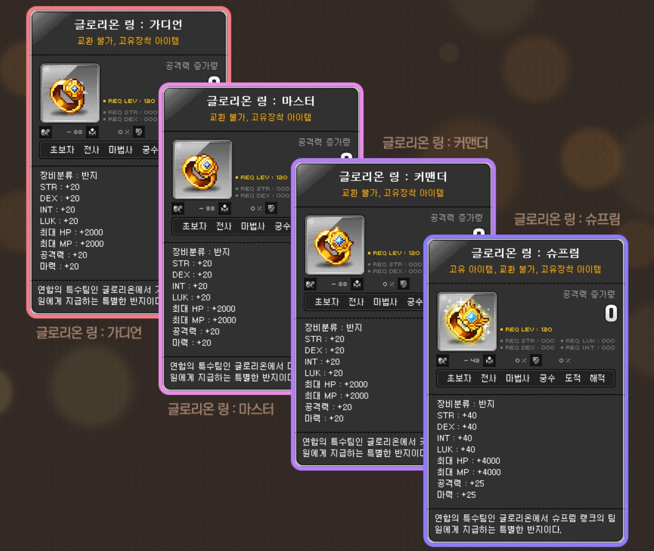 또, 글로리온 랭크를 올릴 때 마다 전초기지에 있는 시그너스로부터 특별 보급 상자를 얻을 수 있습니다. 6단계의 랭크에 따라 주어지는 아이템이 다양한데, 가디언부터 글로리온 링으로 추가 능력치를 더할 수 있으니 더 유용하지 않나 생각되네요. 참고로 각 랭크 당 승급 시기가 7월 4일부터 순차적으로 오픈될 예정이니 미리 글로리움을 모아두시면 빠르게 승급하실 수 있습니다!